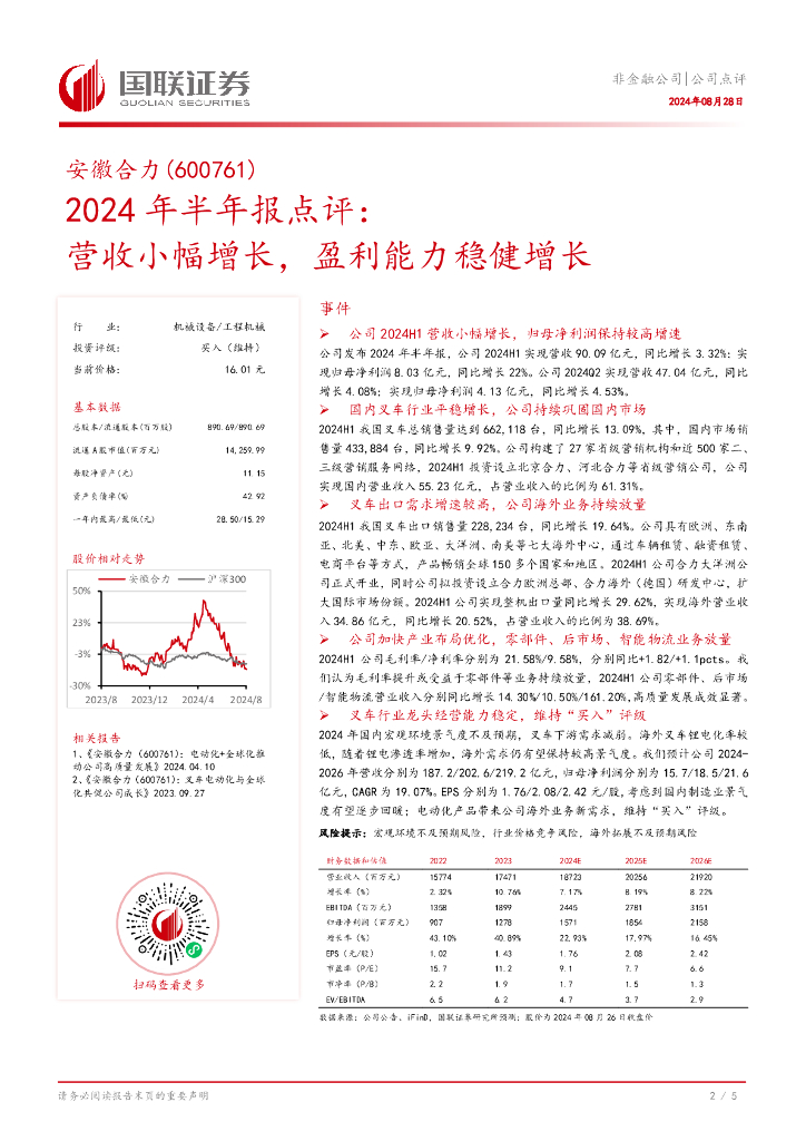国联证券:安徽合力(600761)-2024年半年报点评:营收小幅增长,盈利能力稳健增长.pdf