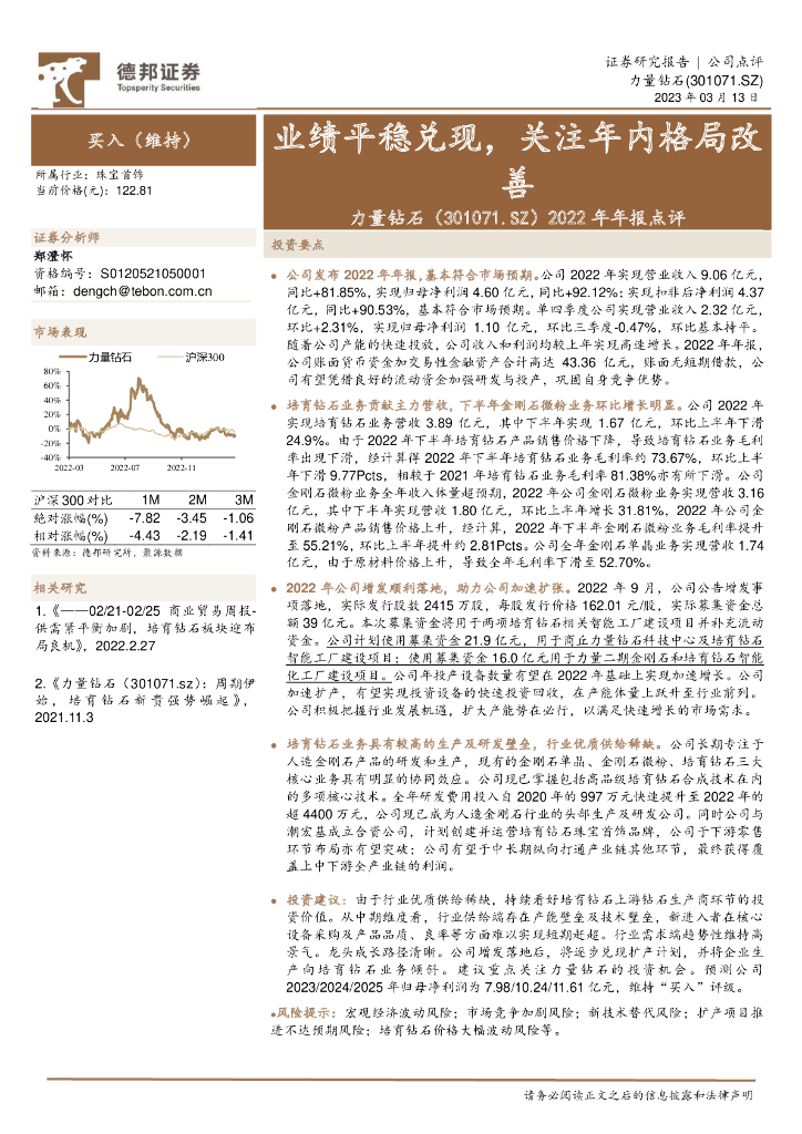 德邦证券:力量钻石(301071)-2022年年报点评:业绩平稳兑现,关注年内格局改善.pdf