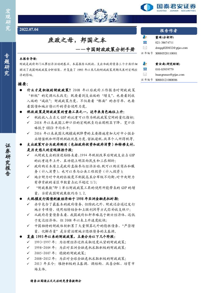 国泰君安:中国财政政策分析手册:庶政之母,邦国之本.pdf