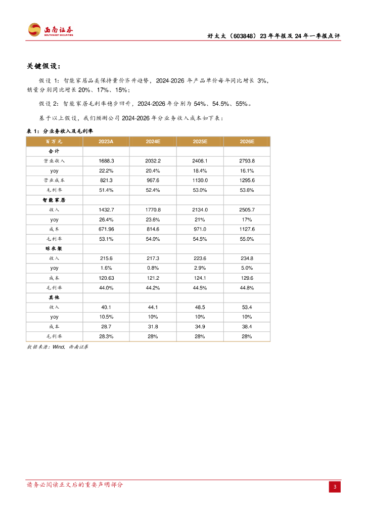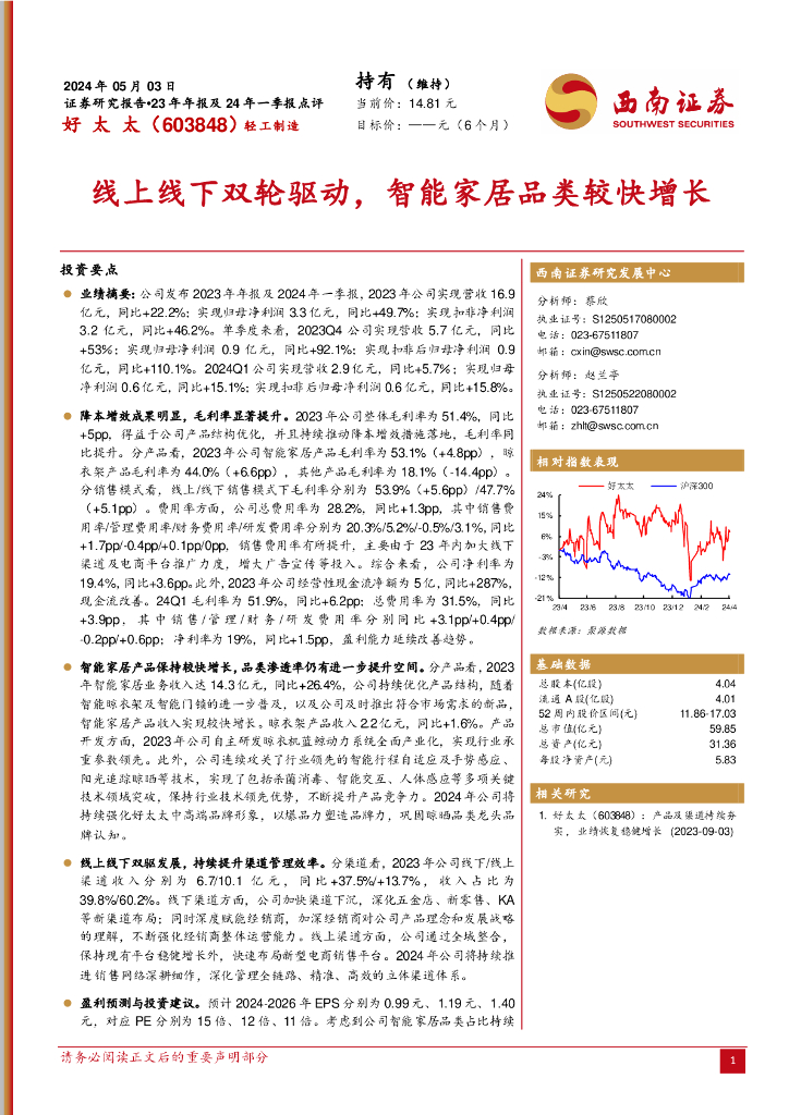 西南证券:好太太(603848)-23年年报及24年一季报点评:线上线下双轮驱动,智能家居品类较快增长.pdf