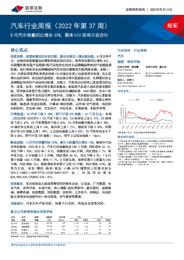 国信证券:汽车行业周报(2022年第37周):8月汽车销量同比增长32%,蔚来ET5即将开启交付.pdf