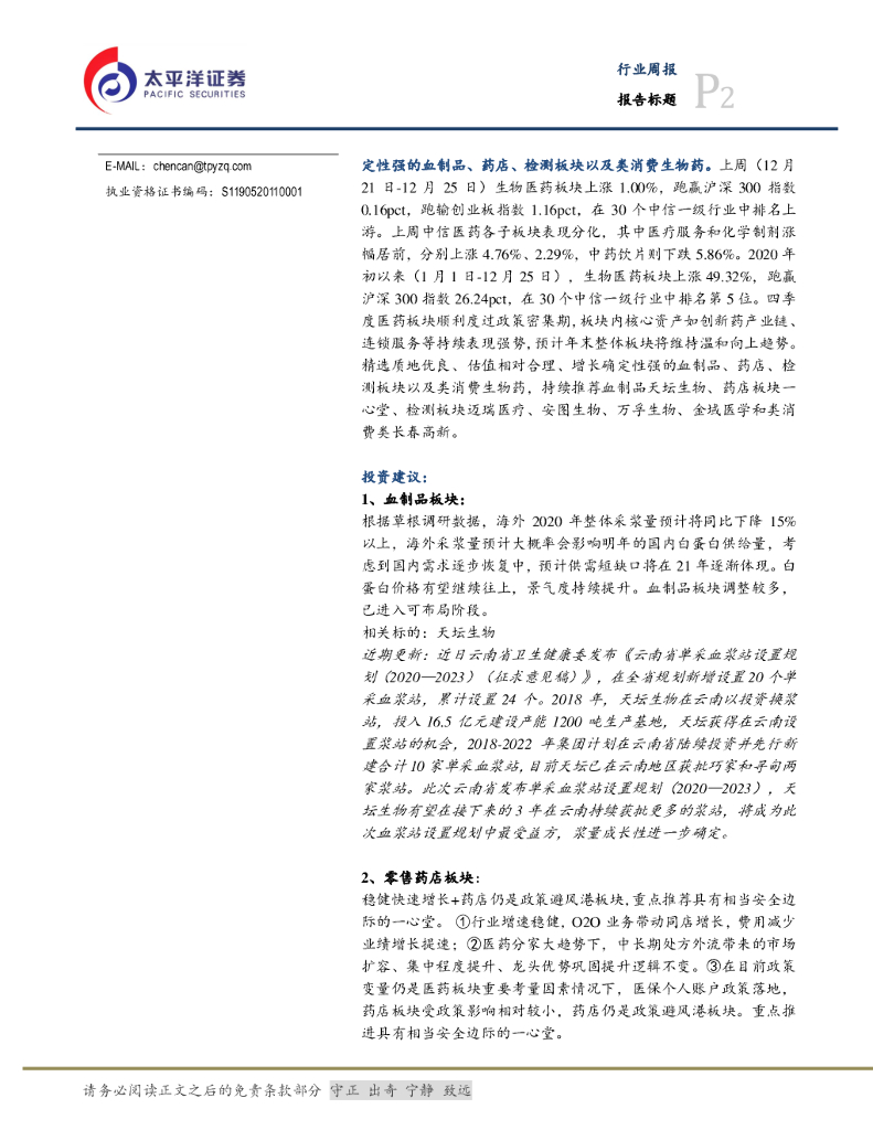 太平洋证券:医药周报:板块温和向上,精选质地优良、增长确定性强的血制品、药店、检测和类消费生物药.pdf