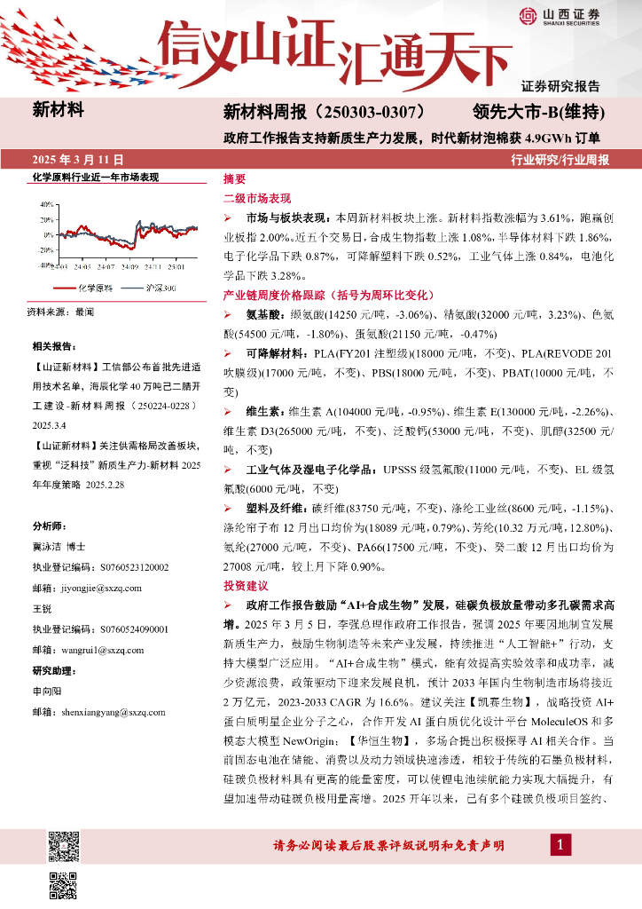 山西证券:新材料行业周报:新材料周报(250303-0307)政府工作报告支持新质生产力发展,时代新材泡棉获4.9GWh订单.pdf