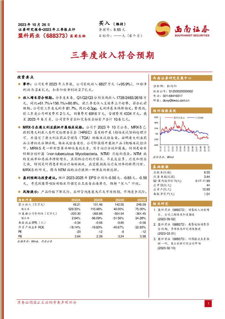 西南证券:盟科药业(688373)-2023年三季报点评:三季度收入符合预期.pdf