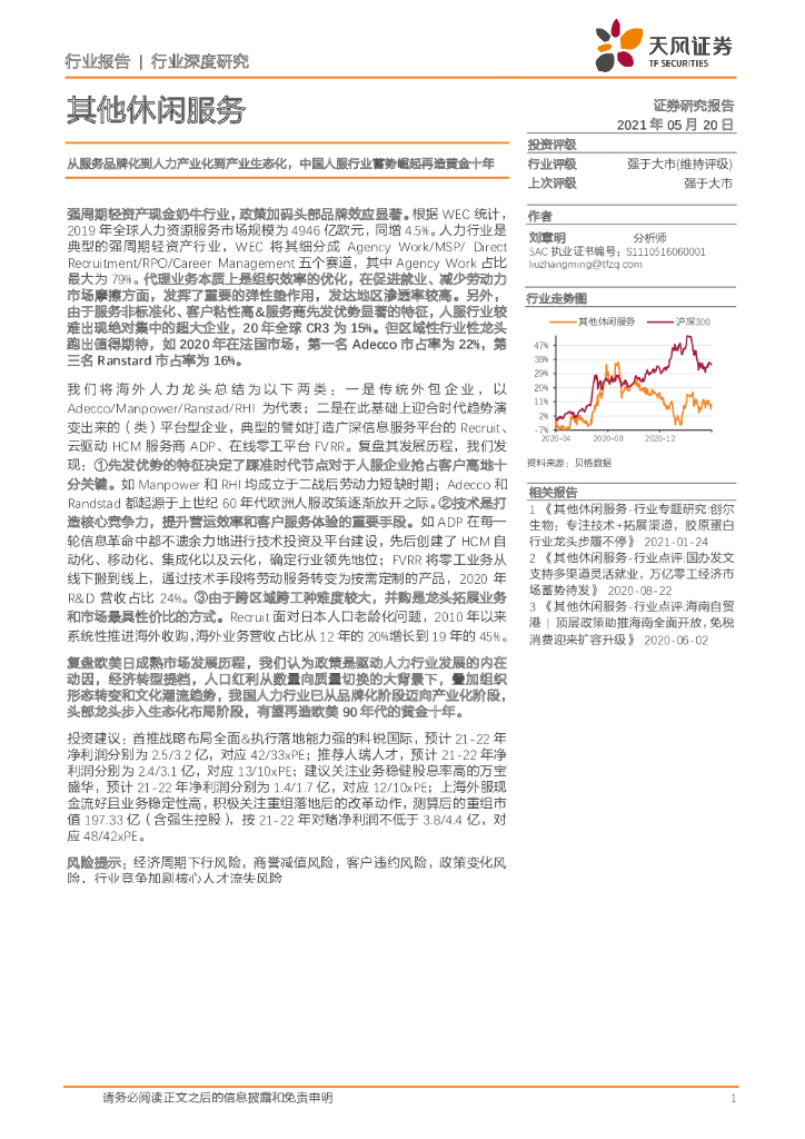 天风证券:其他休闲服务:从服务品牌化到人力产业化到产业生态化,中国人服行业蓄势崛起再造黄金十年.pdf