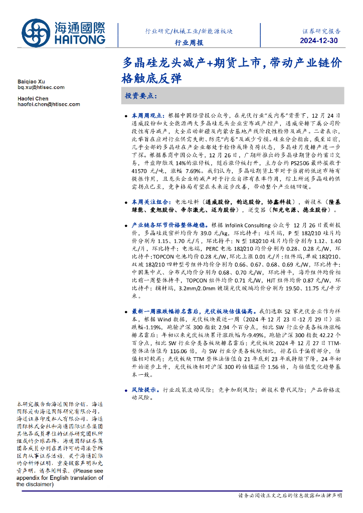 海通国际:新能源板块行业周报:多晶硅龙头减产+期货上市,带动产业链价格触底反弹.pdf