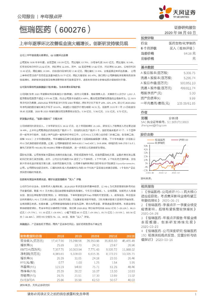 天风证券:恒瑞医药(600276)-上半年逐季环比改善现金流大幅增长,创新研发持续兑现.pdf