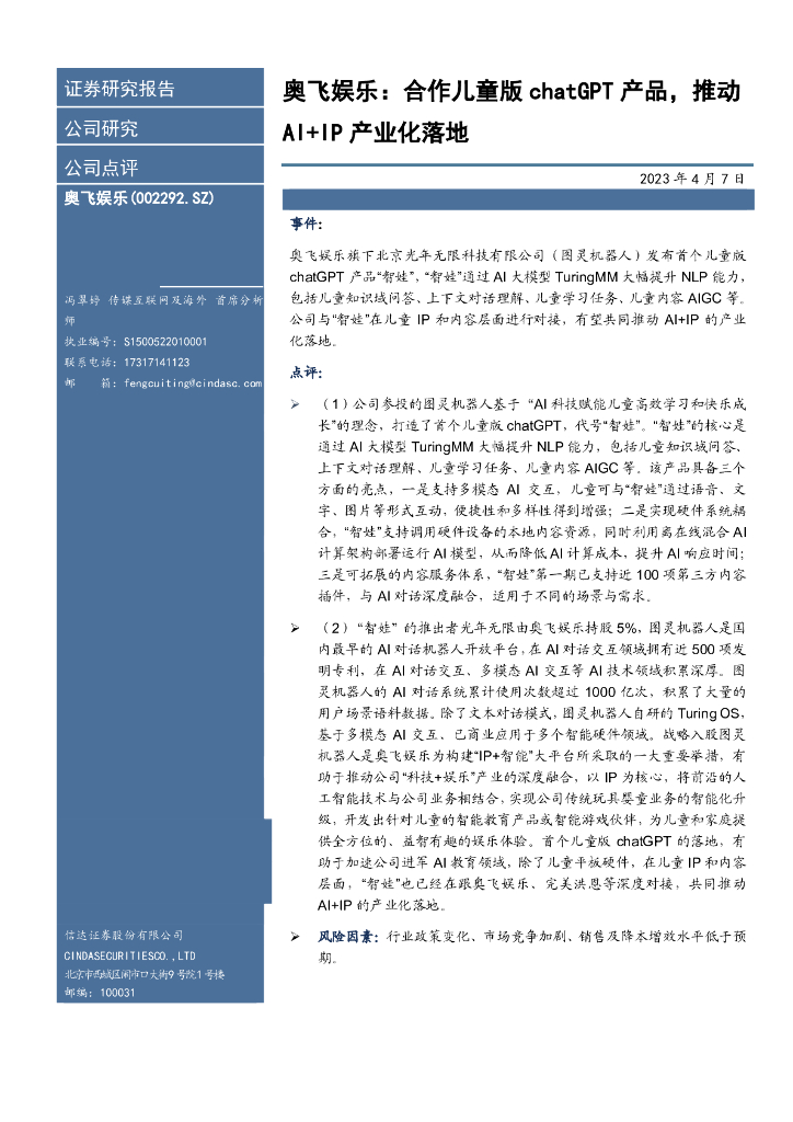 信达证券:奥飞娱乐:合作儿童版chatGPT产品,推动AI+IP产业化落地.pdf