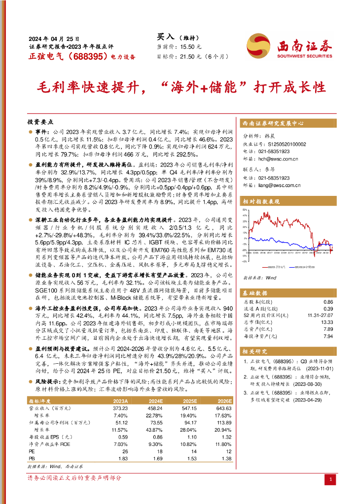 西南证券:正弦电气(688395)-2023年年报点评:毛利率快速提升,“海外+储能”打开成长性.pdf