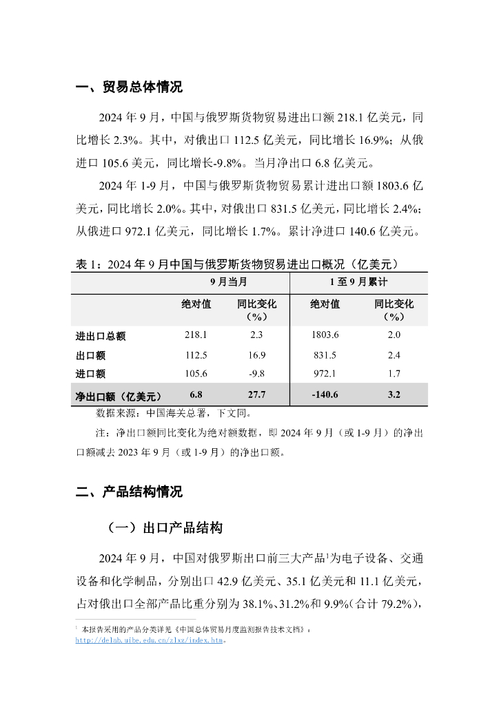 对外经济贸易大学:中俄总体贸易月度监测报告(2024年1-9月).pdf