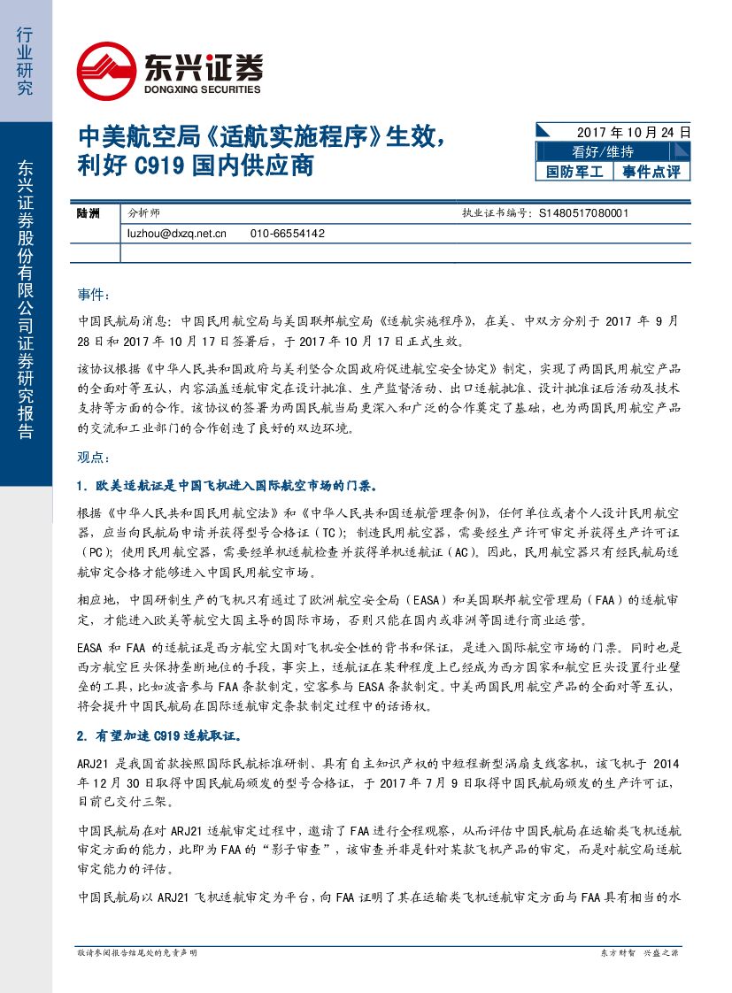 东兴证券:国防军工事件点评:中美航空局《适航实施程序》生效,利好C919国内供应商.pdf