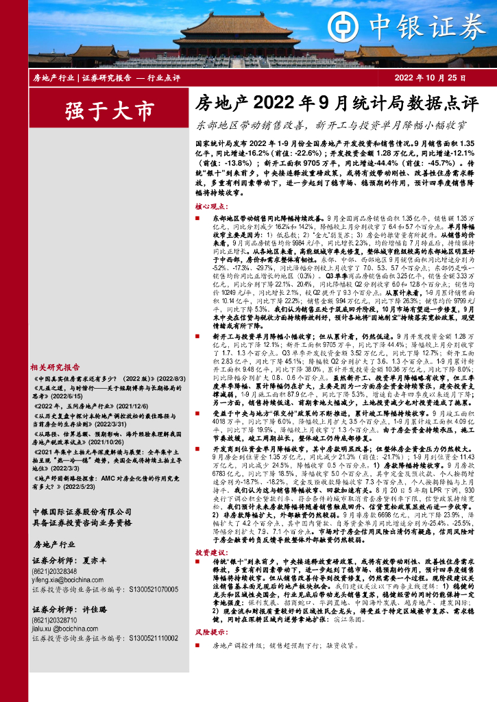 中银证券:房地产2022年9月统计局数据点评:东部地区带动销售改善,新开工与投资单月降幅小幅收窄.pdf