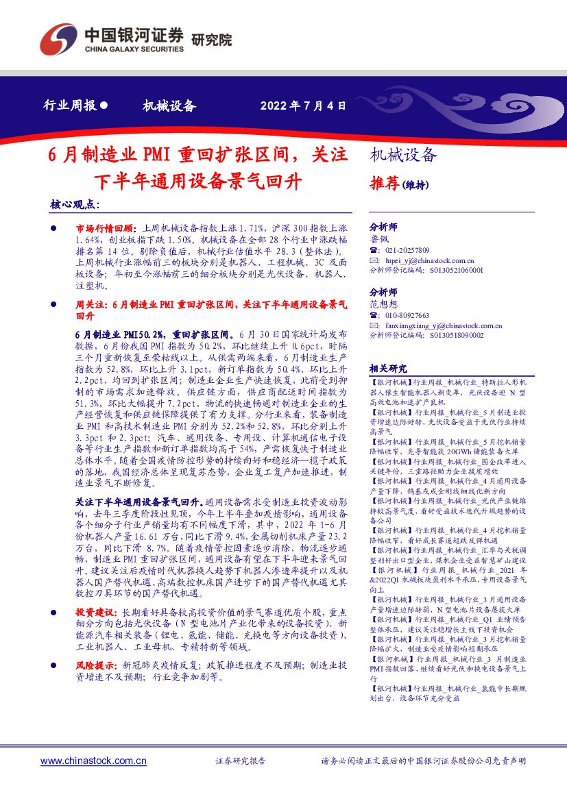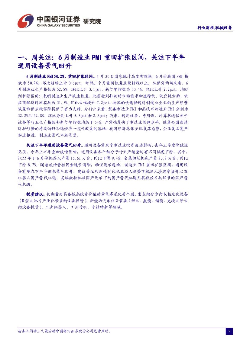 中国银河:机械设备行业周报:6月制造业PMI重回扩张区间,关注下半年通用设备景气回升.pdf