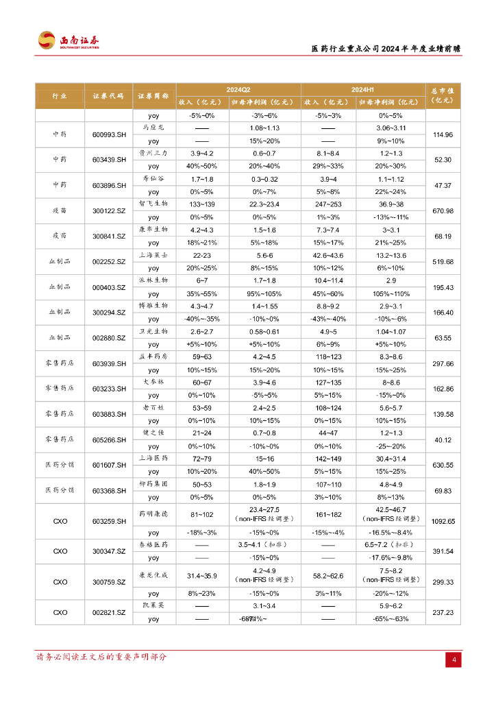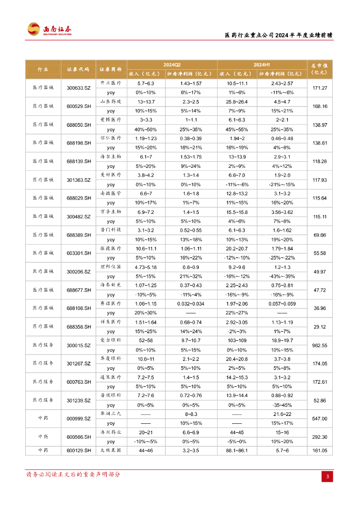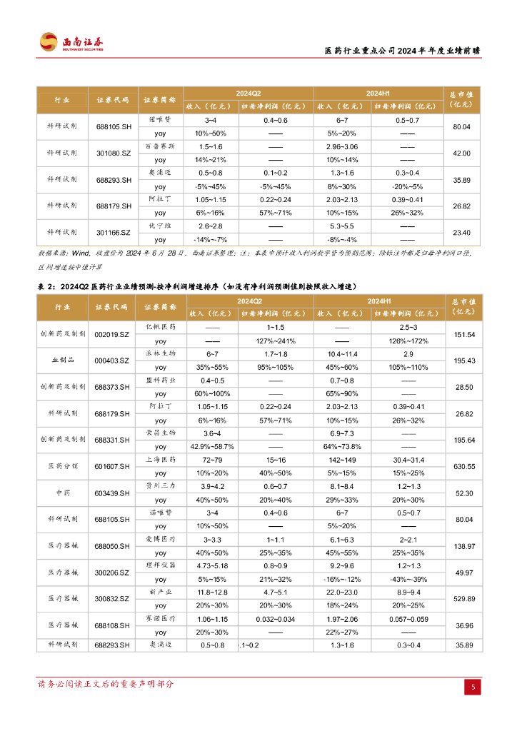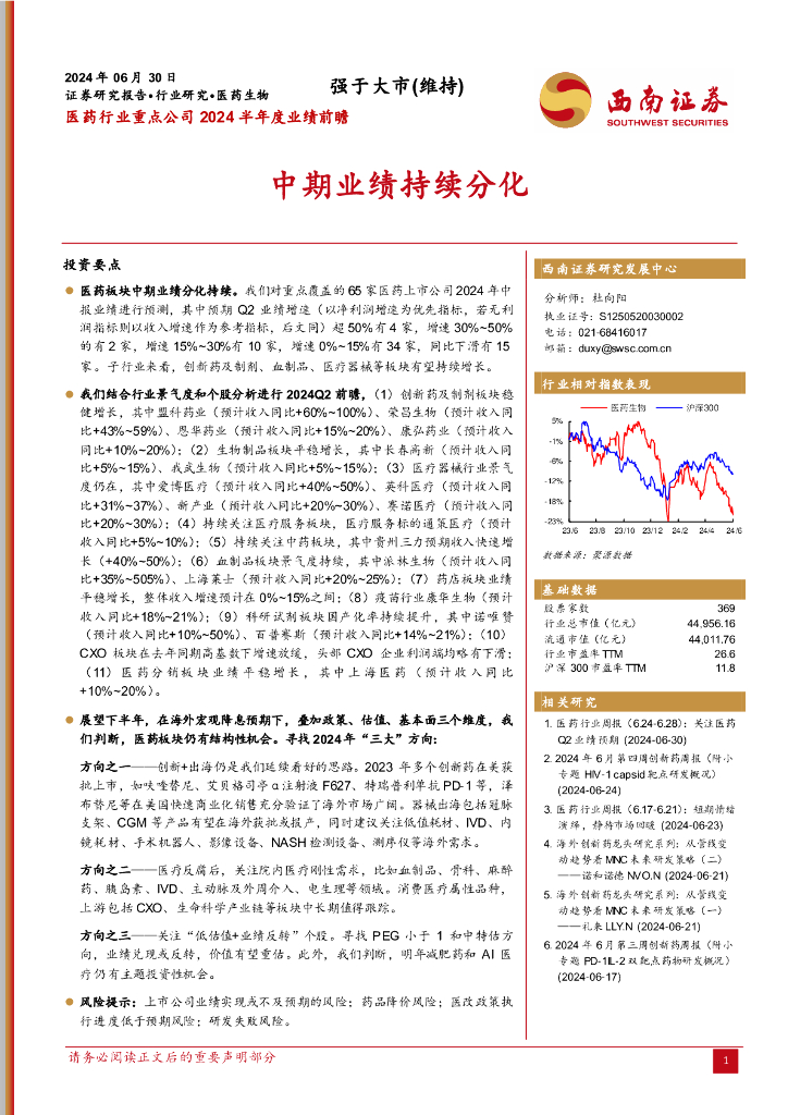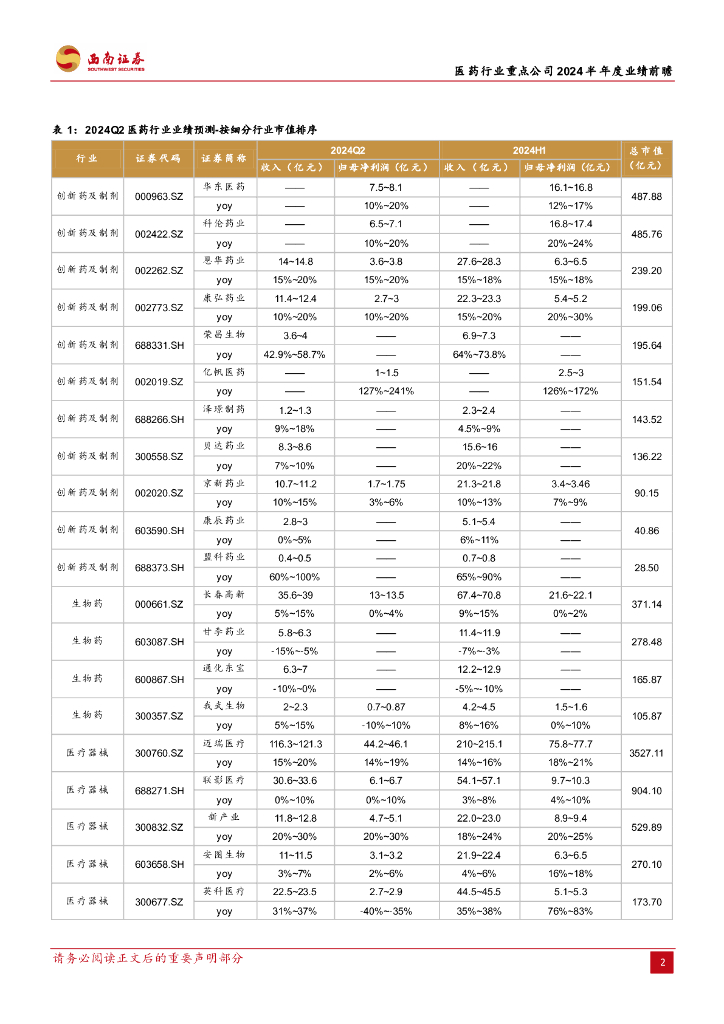 西南证券:医药行业重点公司2024半年度业绩前瞻:中期业绩持续分化.pdf