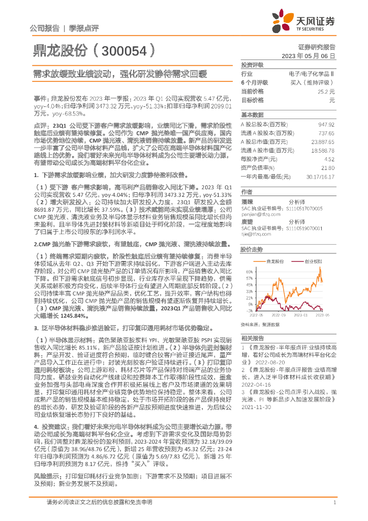 天风证券:鼎龙股份(300054)-需求放缓致业绩波动,强化研发静待需求回暖.pdf
