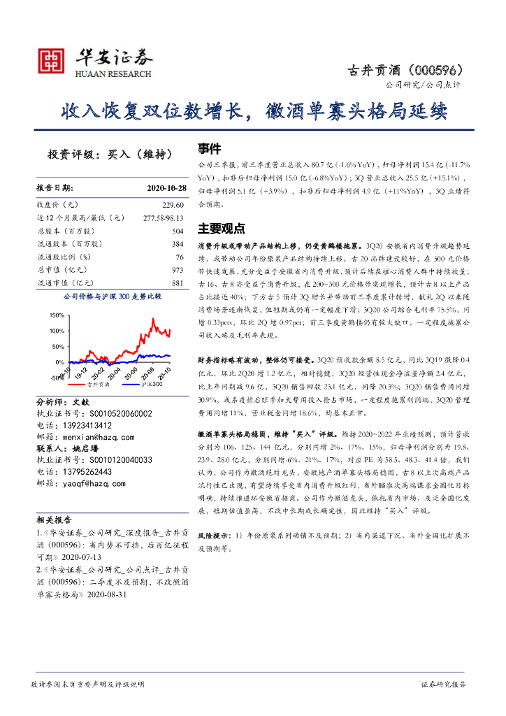华安证券:古井贡酒(000596)-收入恢复双位数增长,徽酒单寡头格局延续.pdf