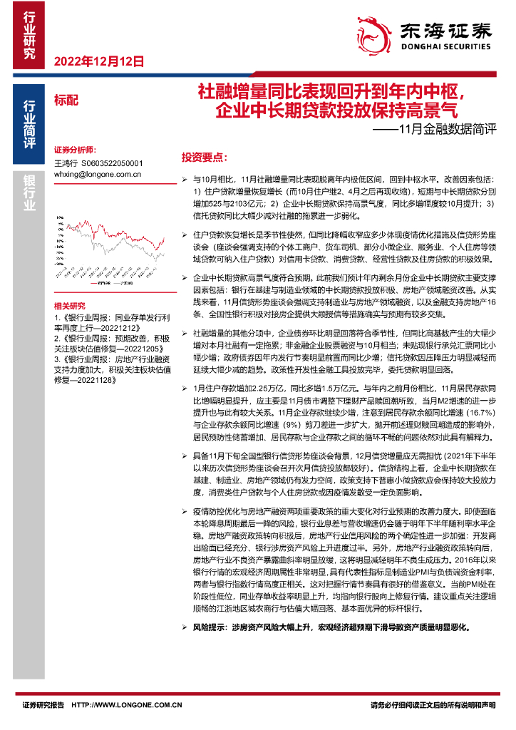 东海证券:银行业11月金融数据简评:社融增量同比表现回升到年内中枢,企业中长期贷款投放保持高景气.pdf
