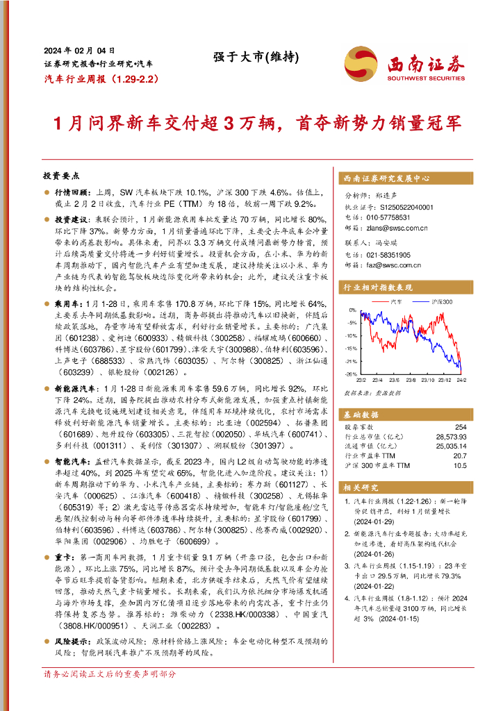 西南证券:汽车行业周报:1月问界新车交付超3万辆,首夺新势力销量冠军.pdf