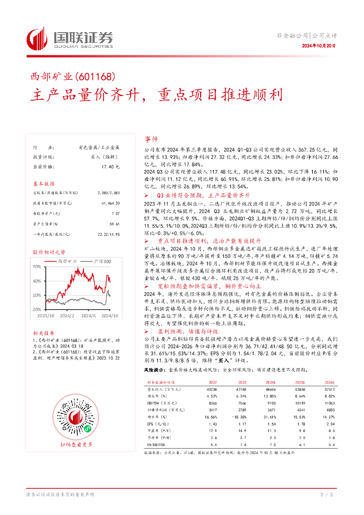 国联证券:西部矿业(601168)-主产品量价齐升,重点项目推进顺利.pdf