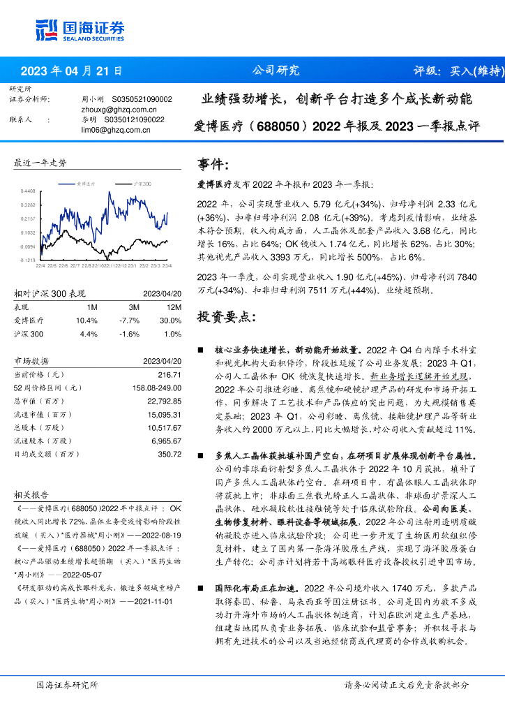 国海证券:爱博医疗(688050)-2022年报及2023一季报点评:业绩强劲增长,创新平台打造多个成长新动能.pdf