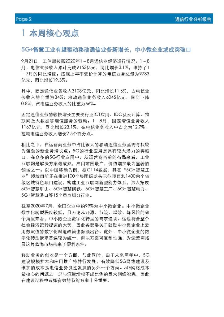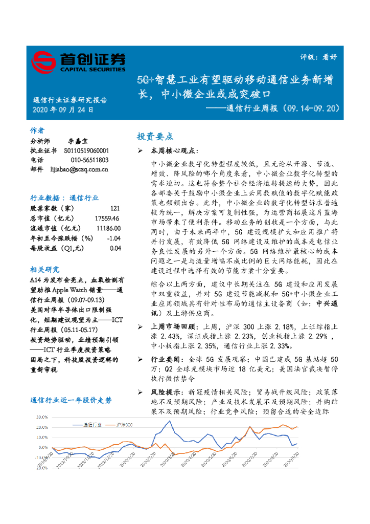 首创证券:通信行业周报:5G+智慧工业有望驱动移动通信业务新增长,中小微企业或成突破口.pdf