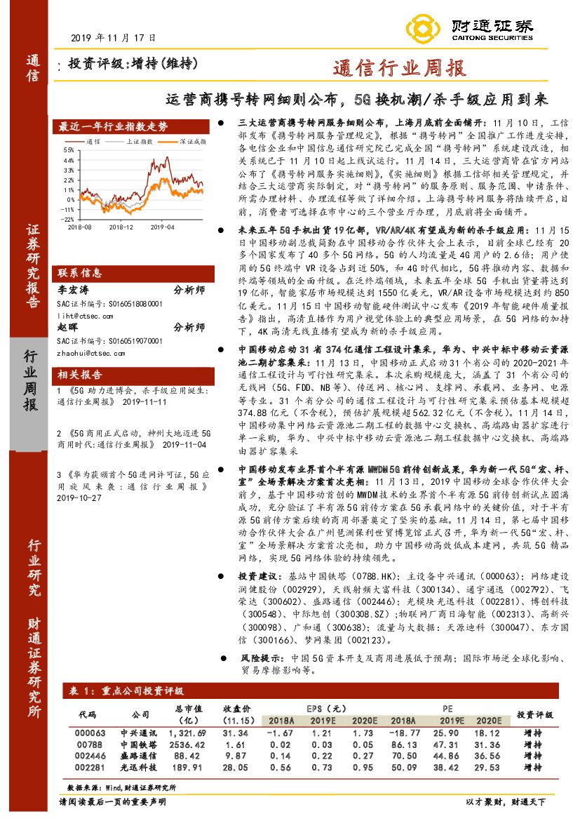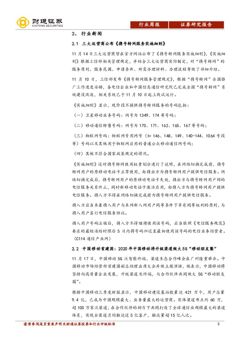 财通证券:通信行业周报:运营商携号转网细则公布,5G换机潮/杀手级应用到来.pdf
