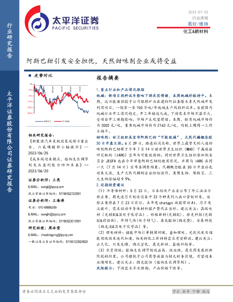 太平洋证券:化工&新材料行业周报:阿斯巴甜引发安全担忧,天然甜味剂企业或将受益.pdf