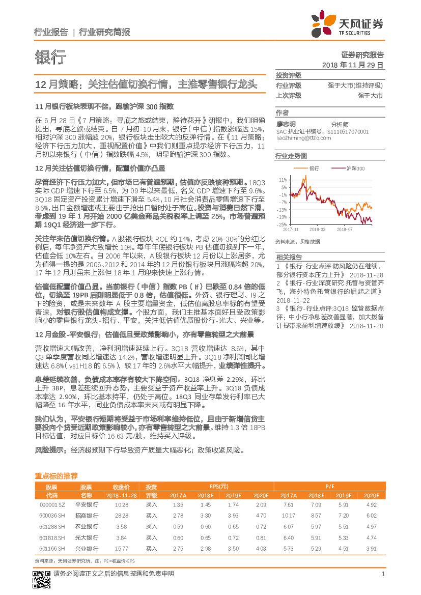 天风证券:银行12月策略:关注估值切换行情,主推零售银行龙头.pdf