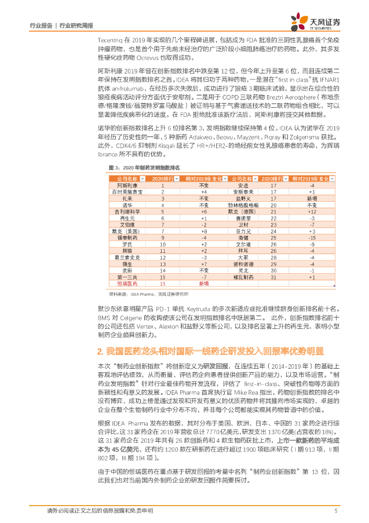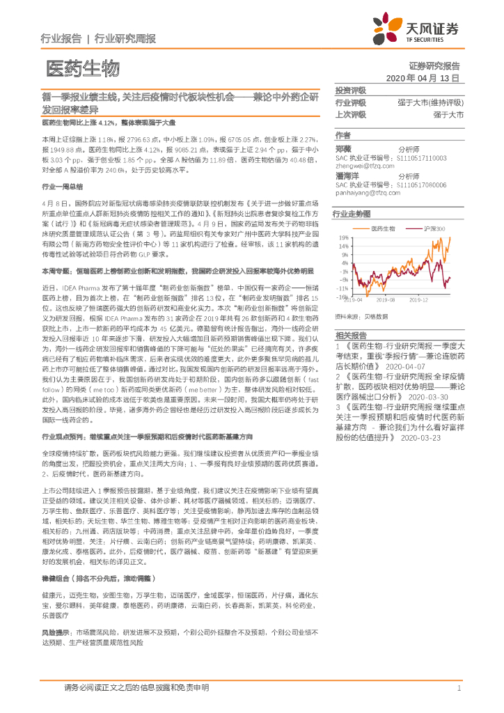 天风证券:医药生物行业研究周报:循一季报业绩主线,关注后疫情时代板块性机会——兼论中外药企研发回报率差异.pdf