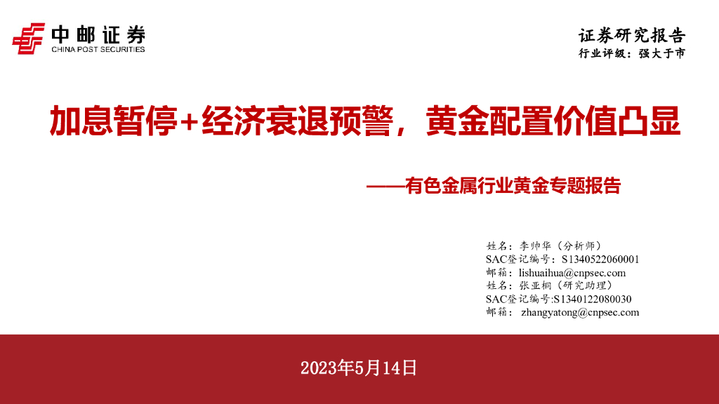 中邮证券:有色金属行业黄金专题报告:加息暂停+经济衰退预警,黄金配置价值凸显.pdf