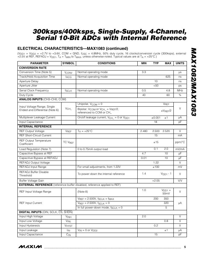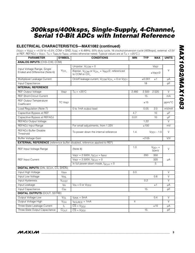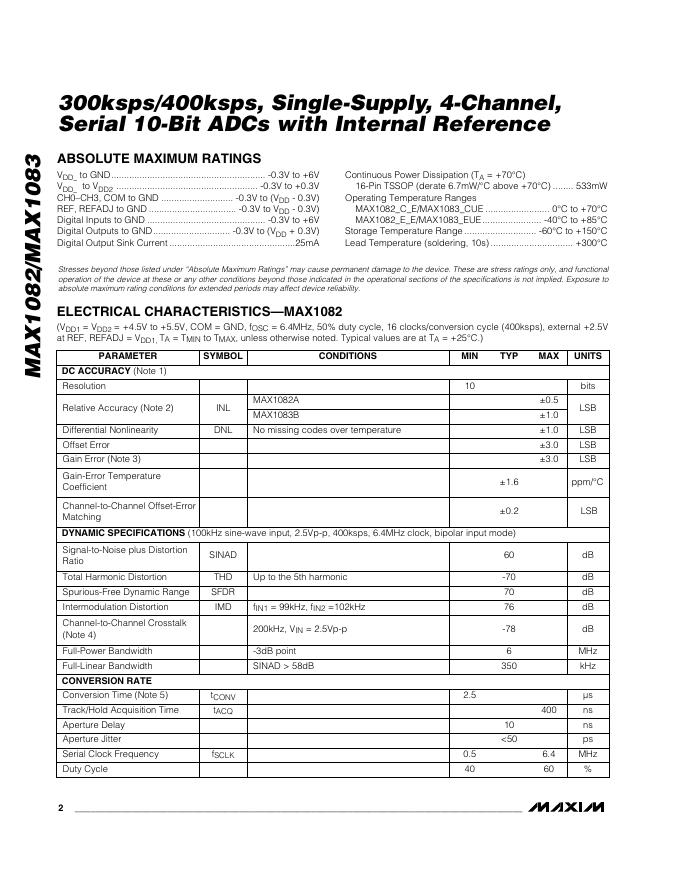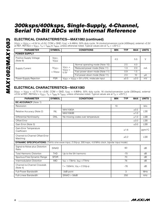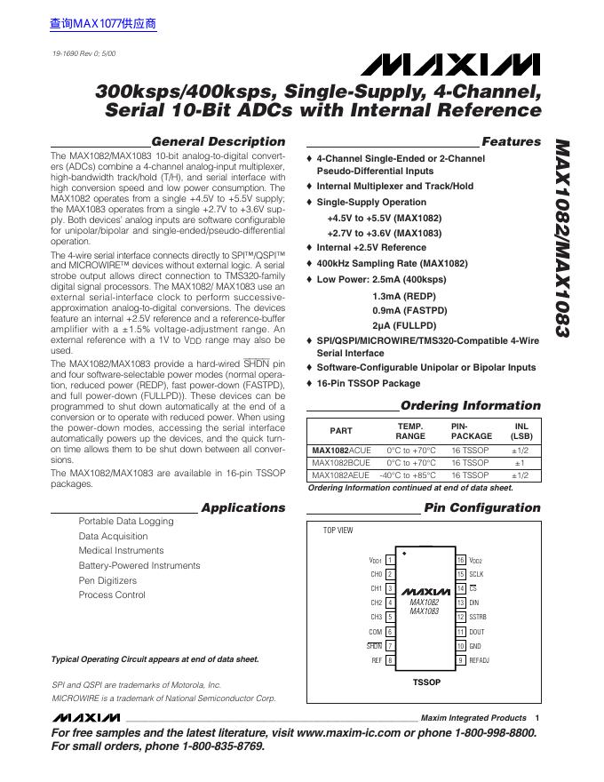 MAXIM MAX1082/MAX1083 300ksps/400ksps, Single-Supply, 4-Channel, Serial 10-Bit ADCs with Internal Reference 数据手册.pdf