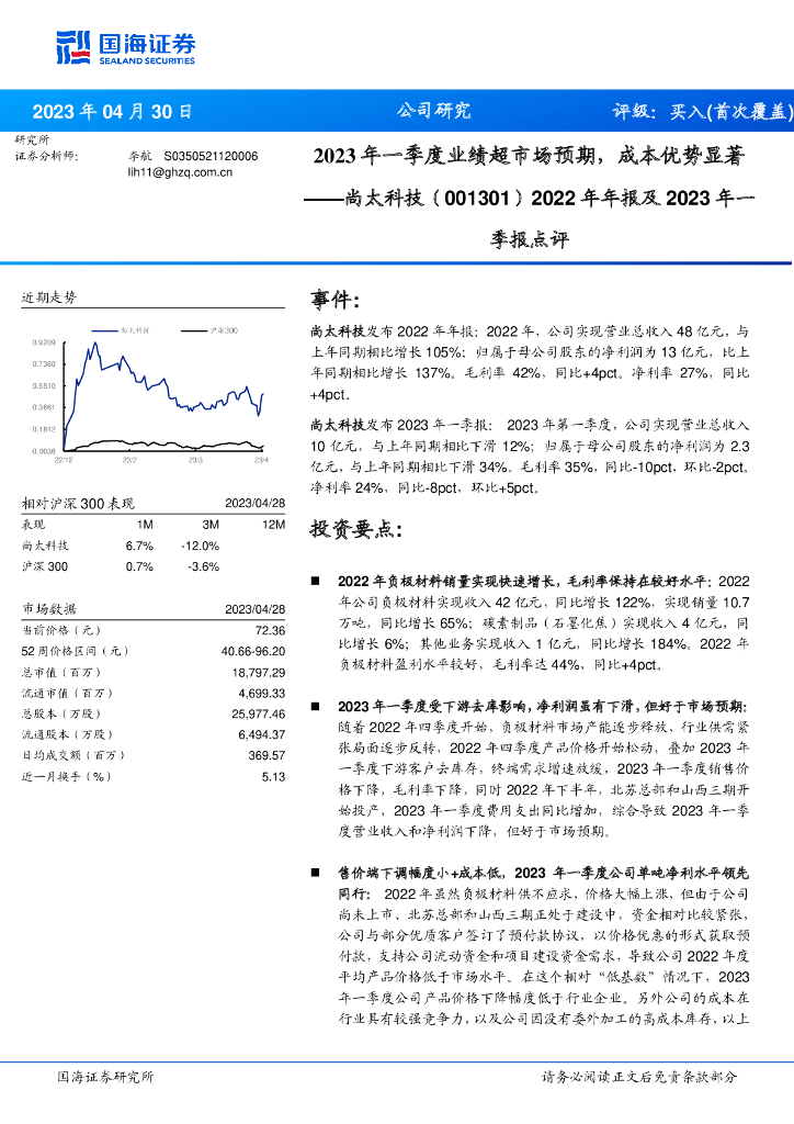 国海证券:尚太科技(001301)-2022年年报及2023年一季报点评:2023年一季度业绩超市场预期,成本优势显著.pdf