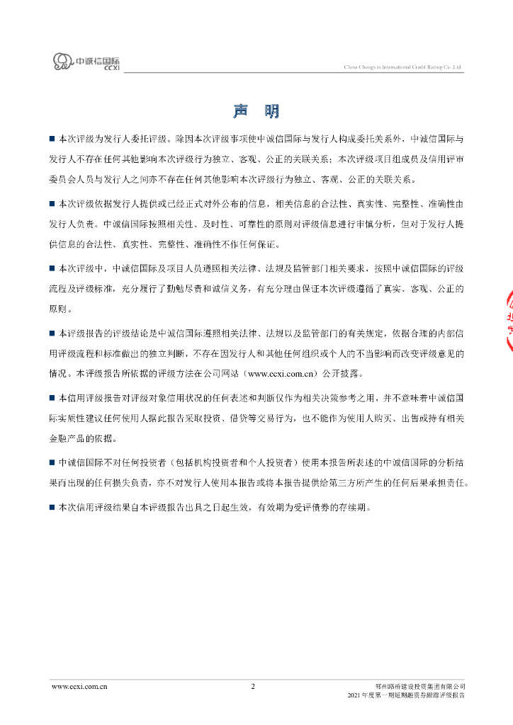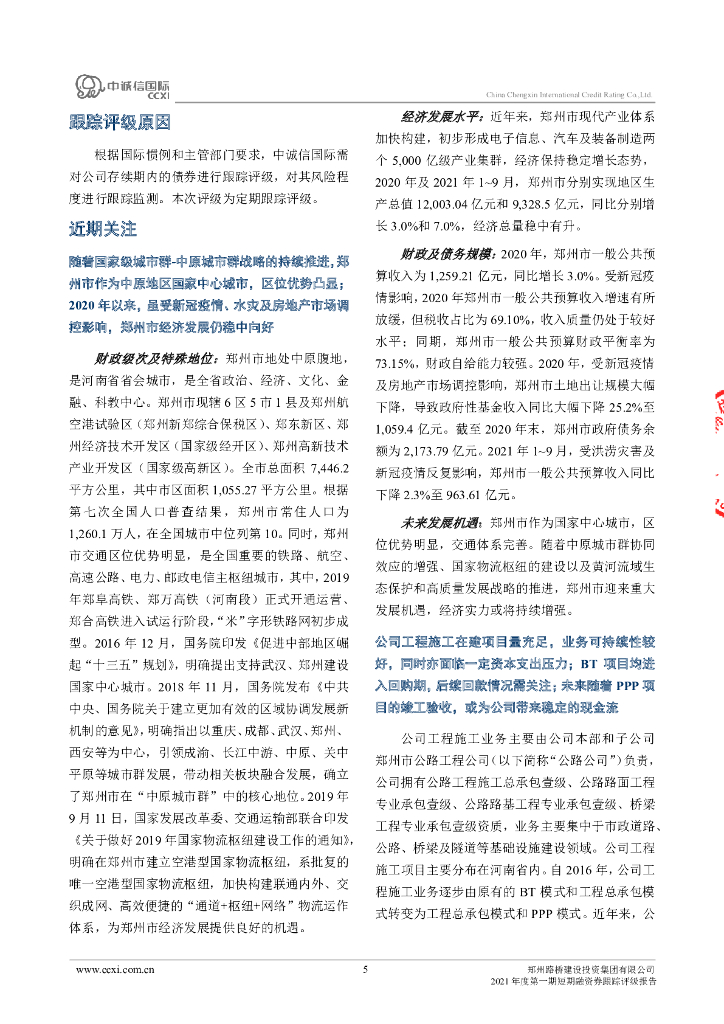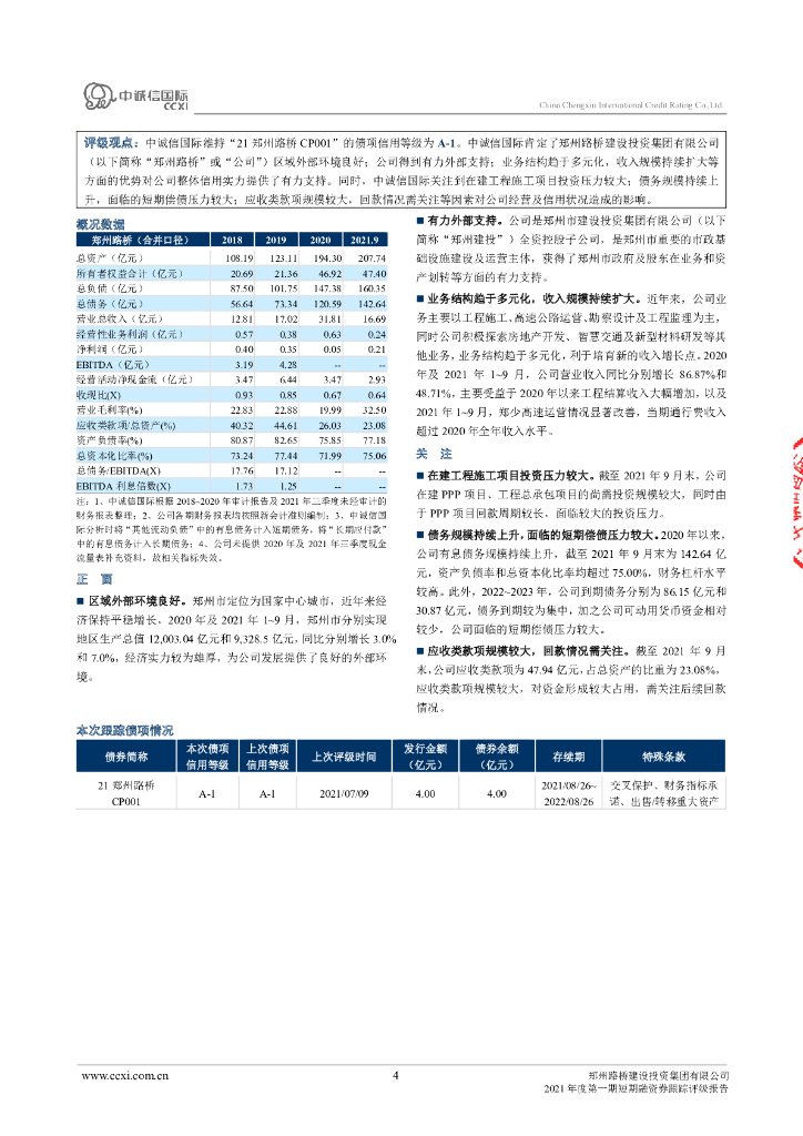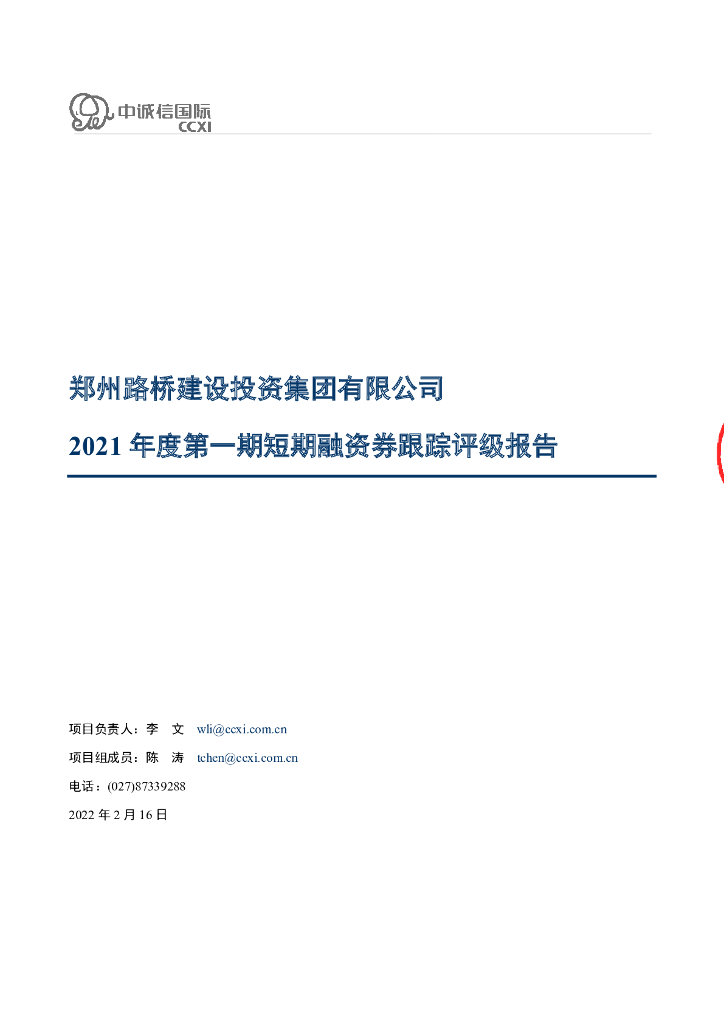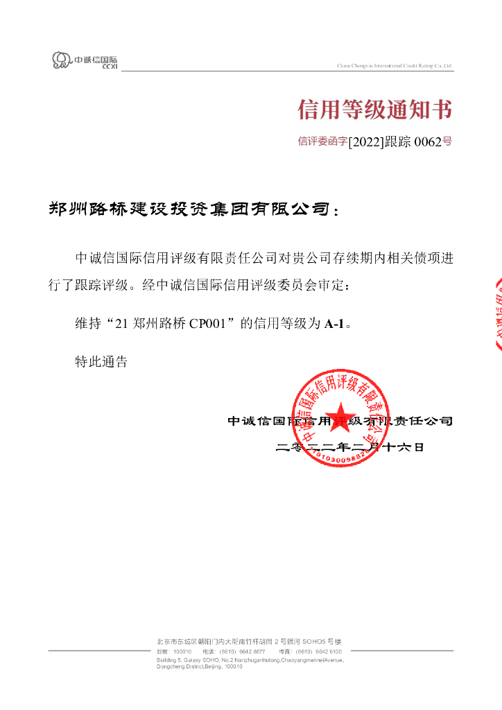 中诚信:郑州路桥建设投资集团有限公司2021年度第一期短期融资券跟踪评级报告.pdf