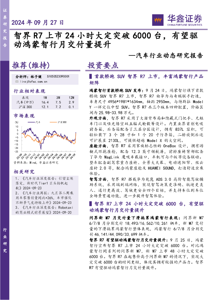 华鑫证券:汽车行业动态研究报告:智界R7上市24小时大定突破6000台,有望驱动鸿蒙智行月交付量提升.pdf