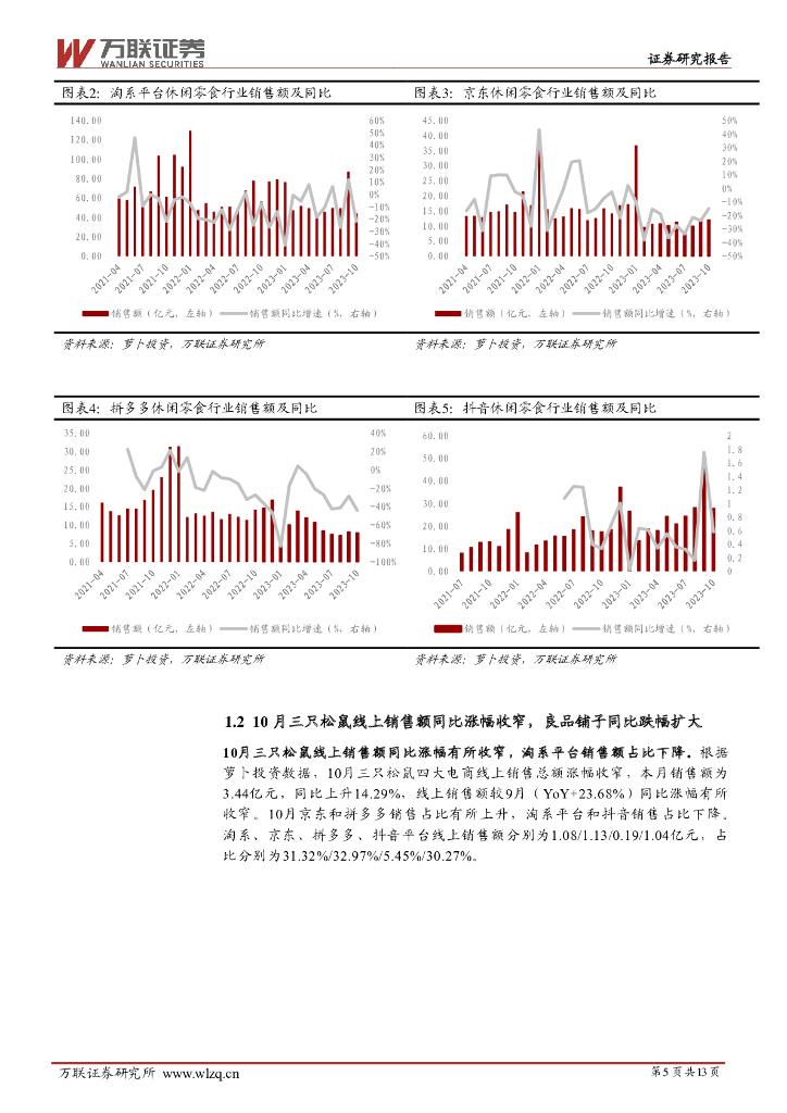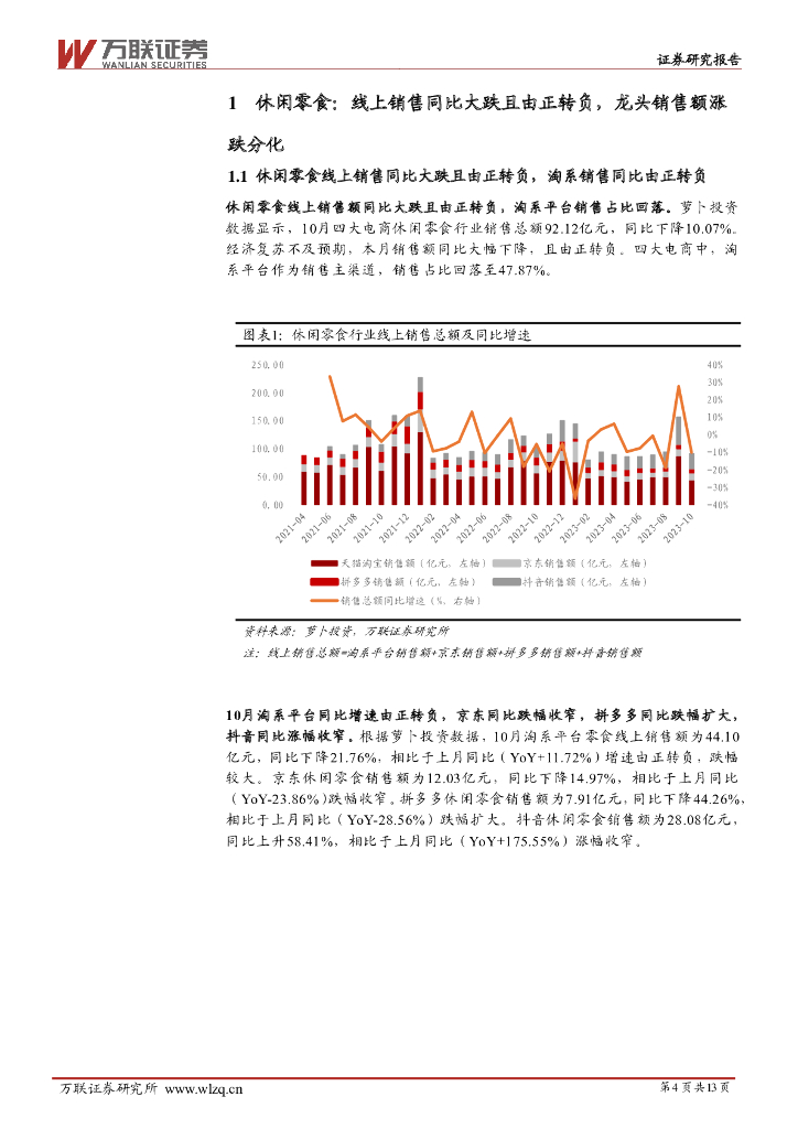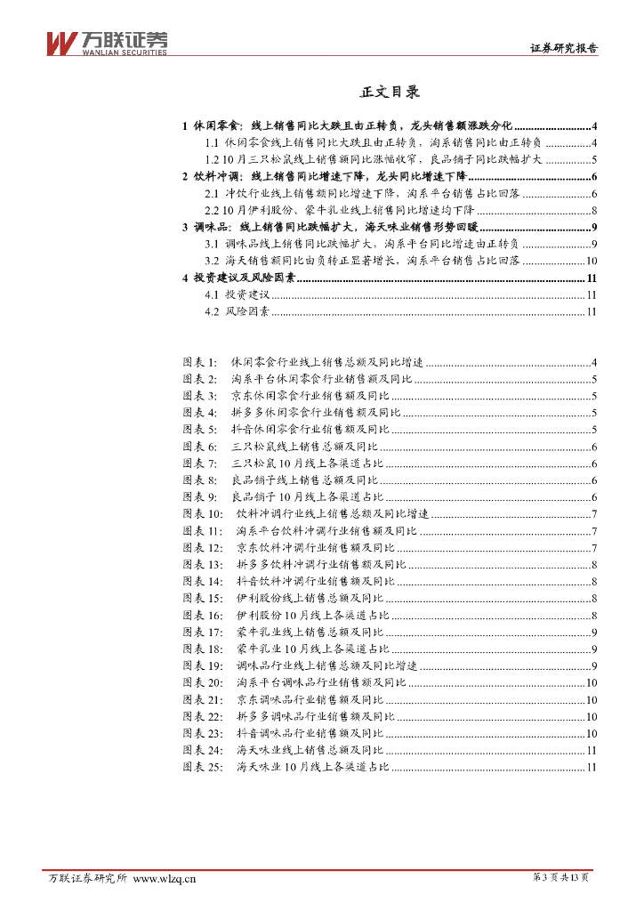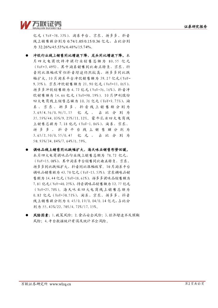 万联证券:大众食品10月电商数据跟踪:各品类线上销售同比增速均较9月下降,冲饮保持正增长.pdf