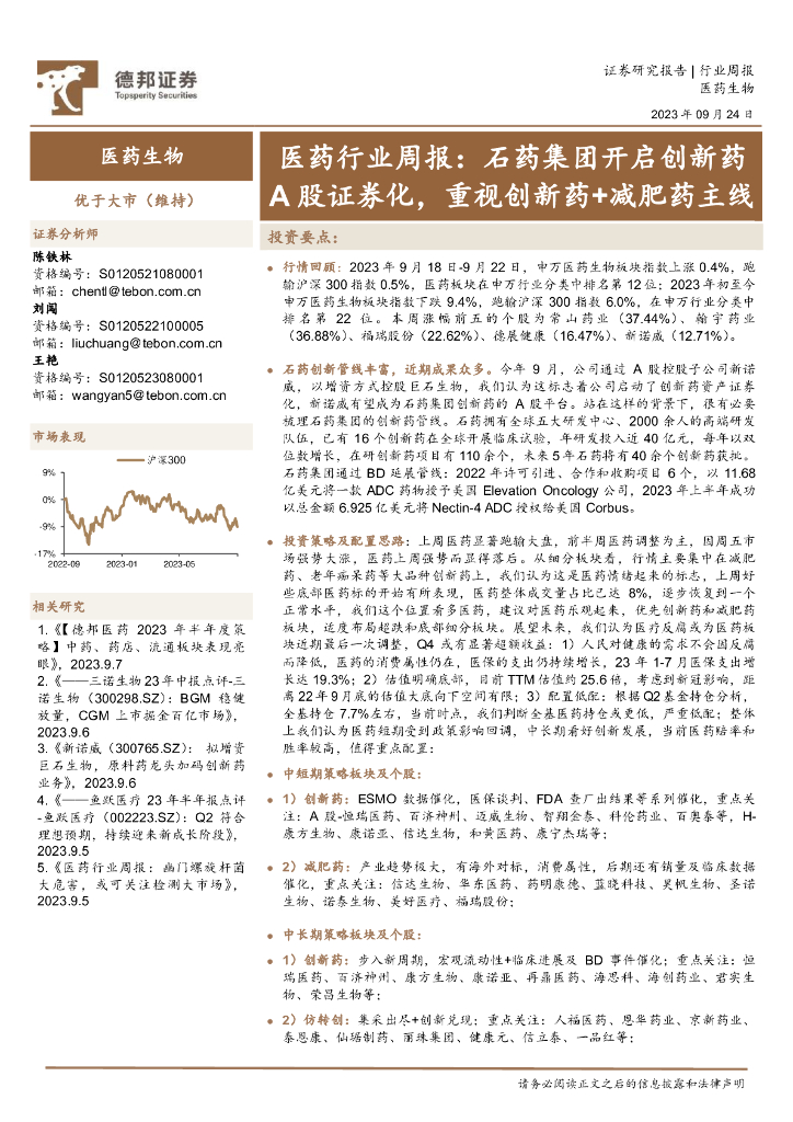 德邦证券:医药行业周报:石药集团开启创新药A股证券化,重视创新药+减肥药主线.pdf