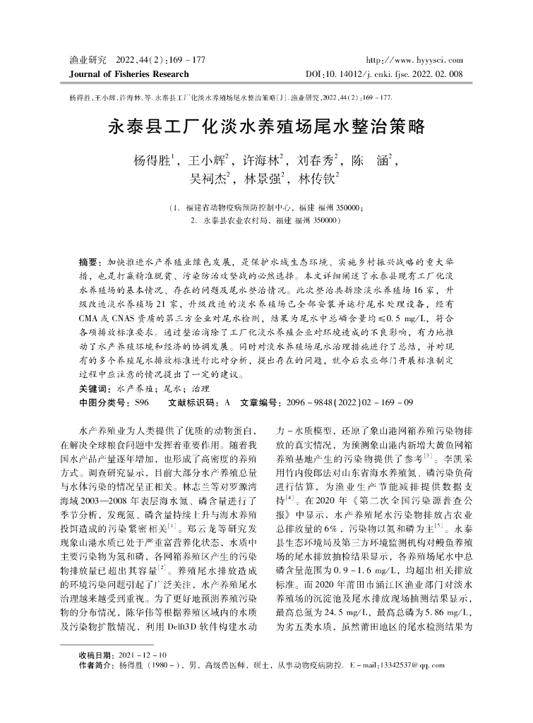加快推进水产养殖业绿色发展,是保护水域生态环境、实施乡村振兴战略的重大举措,也是打赢精准脱贫、污染防治攻坚战的必然选择。本文详细阐述了永泰县现有工厂化淡水养殖场的基本情况、存在的问题及尾水整治情况。此次整">
