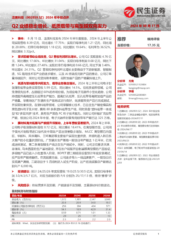 民生证券:洁美科技(002859)-2024年中报点评:Q2业绩稳步增长,纸质载带与离型膜双向发力.pdf