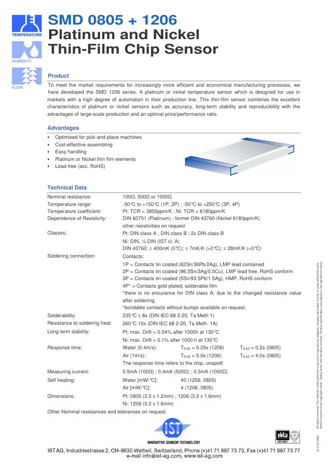 IST Platinum Temperature Sensors SMD 0805 + 1206 Platinum and Nickel Thin-Film Chip Sensor 数据手册.pdf