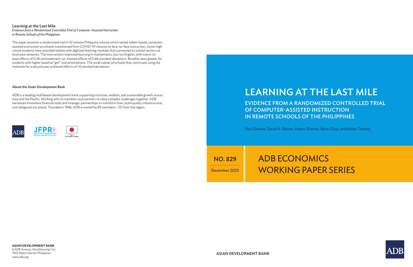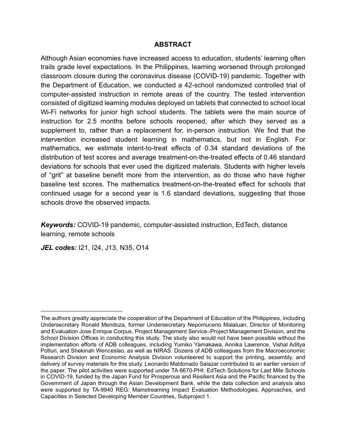 ADB亚洲开发银行:最后一英里的学习:来自菲律宾偏远学校计算机辅助教学随机对照试验的证据(英文版).pdf
