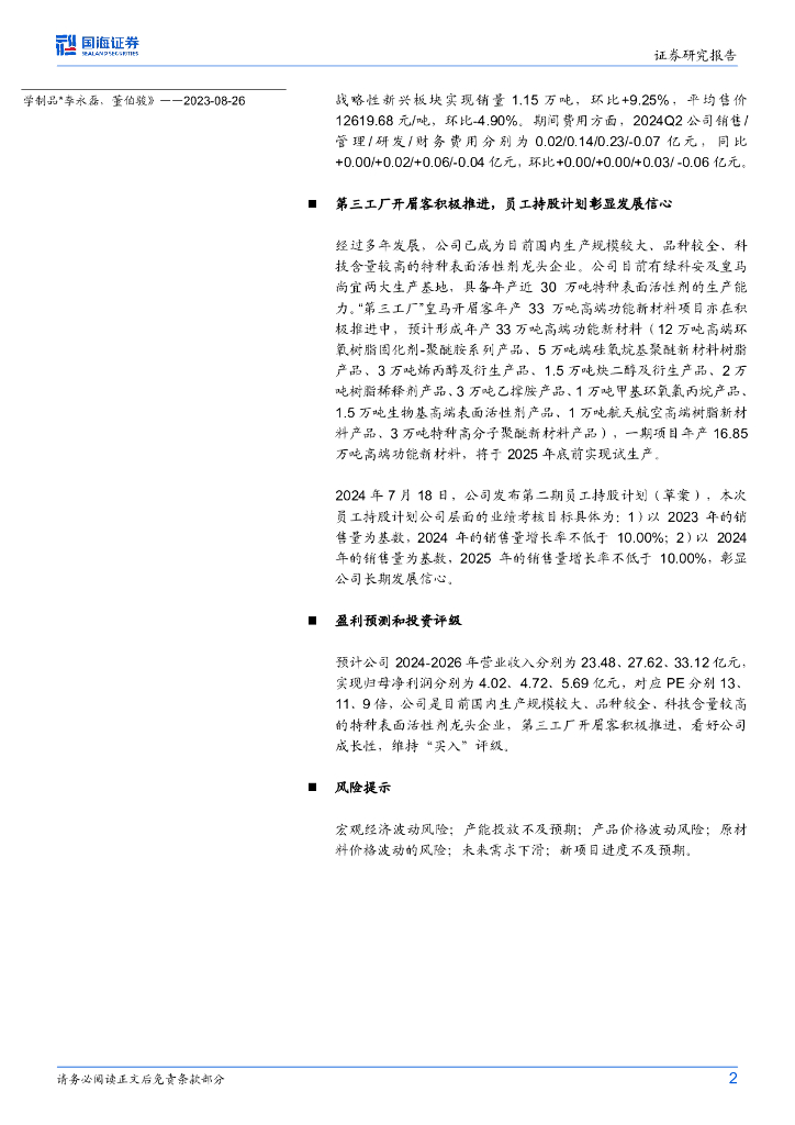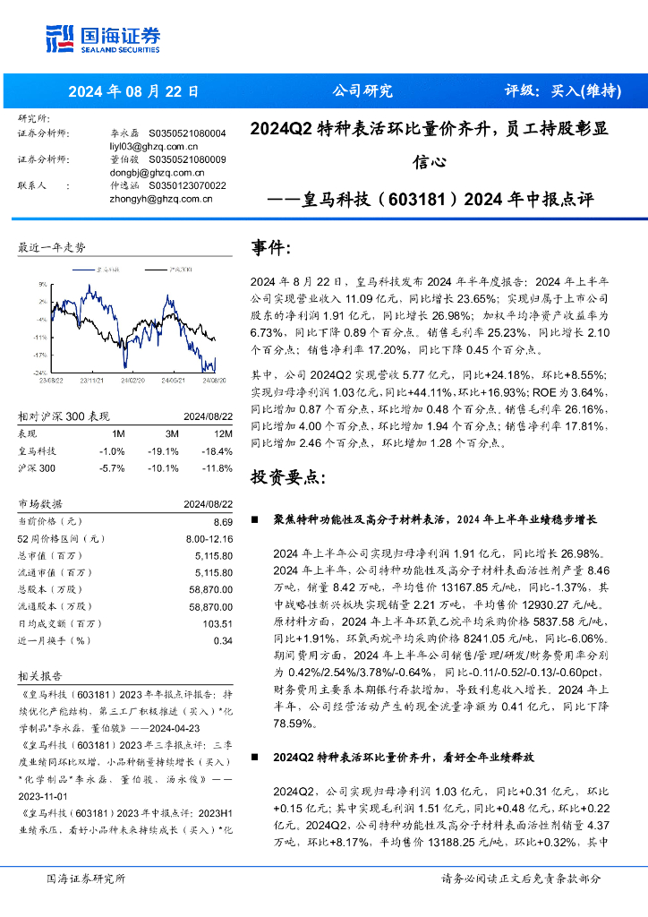 国海证券:皇马科技(603181)-2024年中报点评:2024Q2特种表活环比量价齐升,员工持股彰显信心.pdf