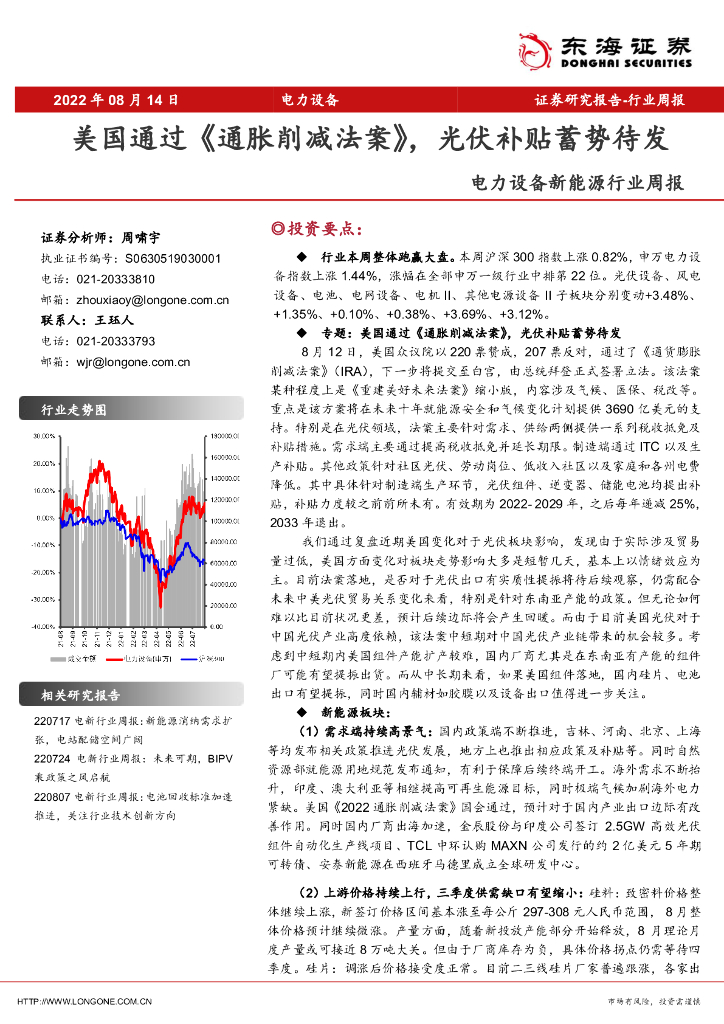 东海证券:电力设备新能源行业周报:美国通过《通胀削减法案》,光伏补贴蓄势待发.pdf