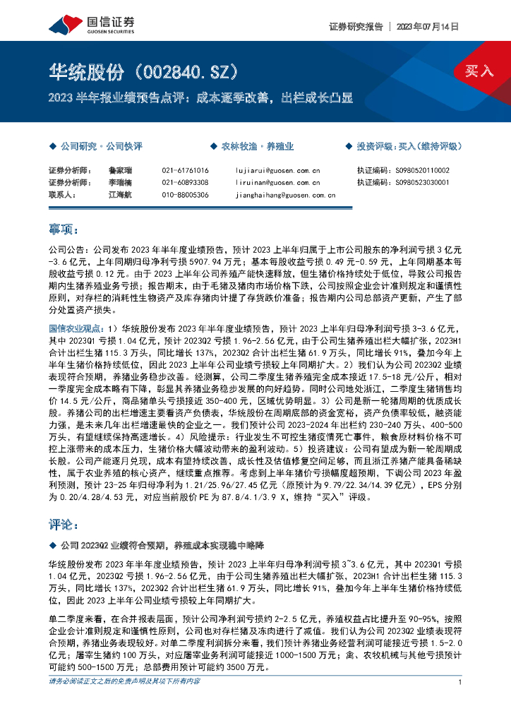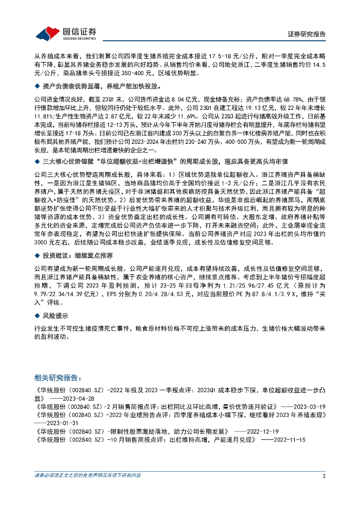 国信证券:华统股份(002840)-2023半年报业绩预告点评:成本逐季改善,出栏成长凸显.pdf