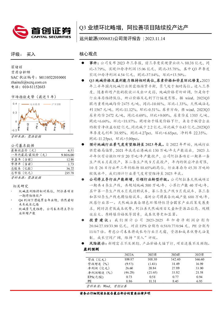 首创证券:远兴能源(000683)-公司简评报告:Q3业绩环比略增,阿拉善项目陆续投产达产.pdf