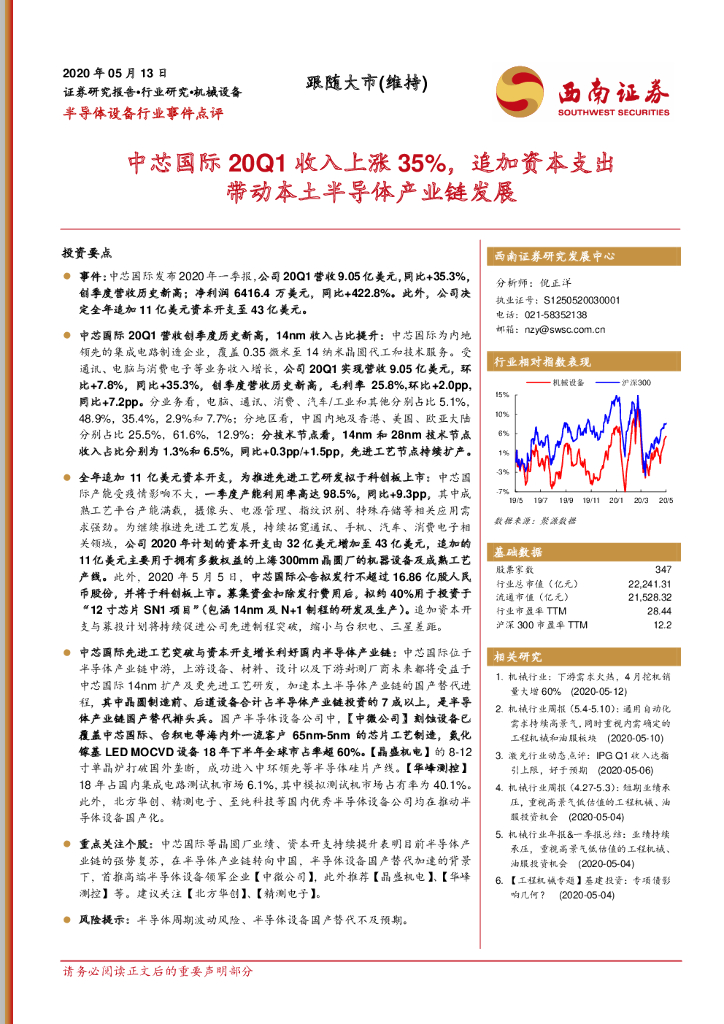 西南证券:半导体设备行业事件点评:中芯国际20Q1收入上涨35%,追加资本支出带动本土半导体产业链发展.pdf