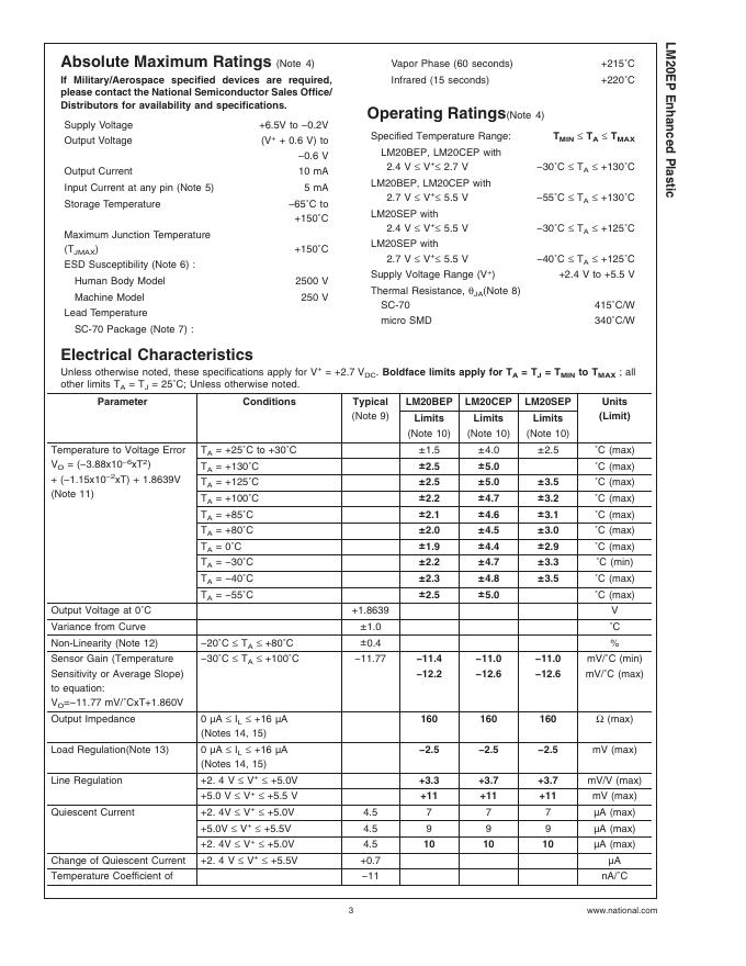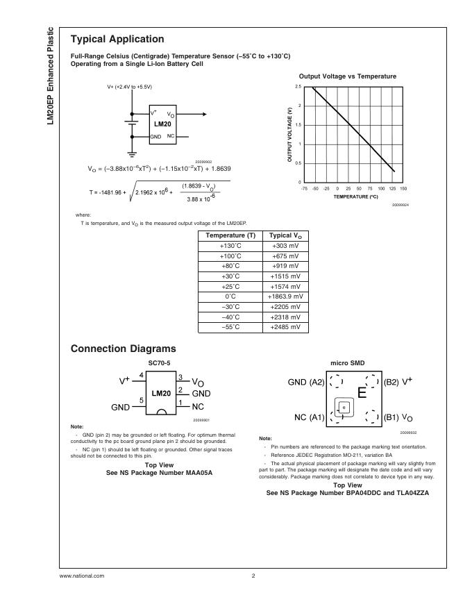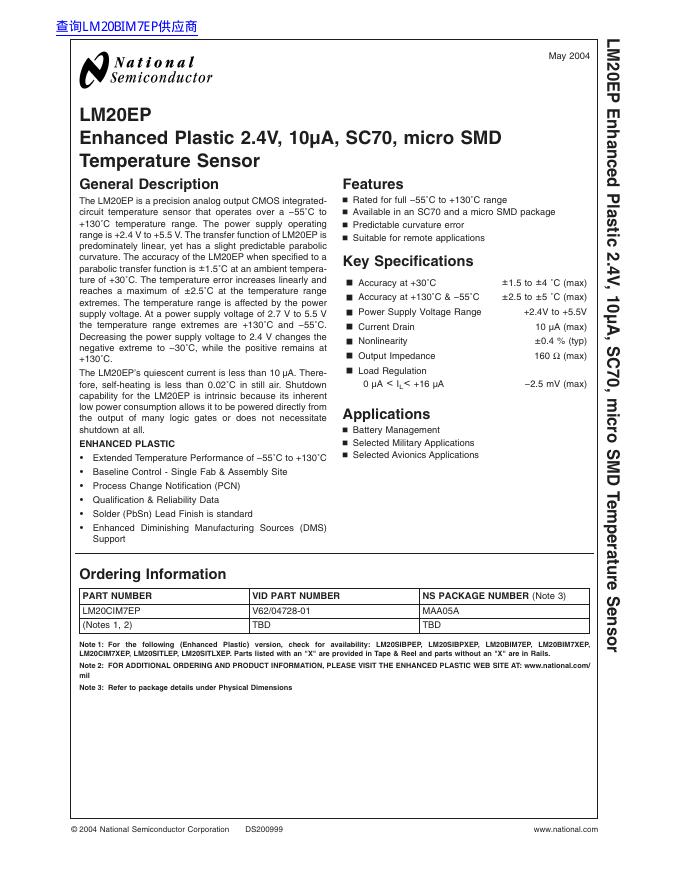 National semiconductor LM20EP Enhanced Plastic 2.4V, 10µA, SC70, micro SMD Temperature Sensor 数据手册.pdf