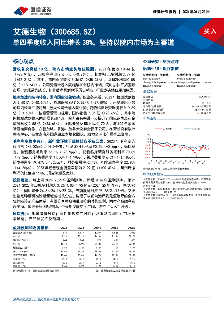 国信证券:艾德生物(300685)-单四季度收入同比增长38%,坚持以院内市场为主赛道.pdf