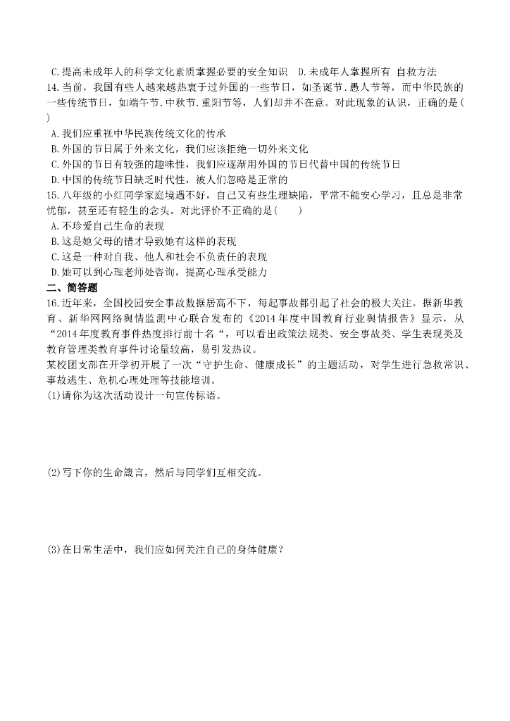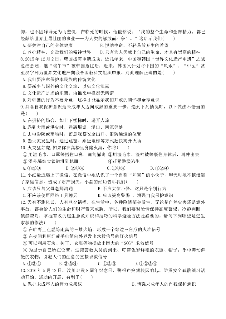 七年级上册 初中道德与法治4.9.1《守护生命》基础训练.doc