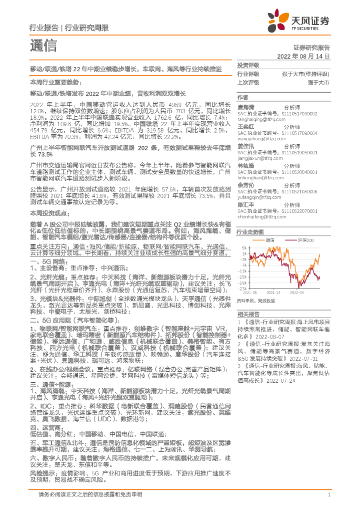 天风证券:通信行业研究周报:移动/联通/铁塔22年中期业绩稳步增长,车联网、海风等行业持续推进.pdf