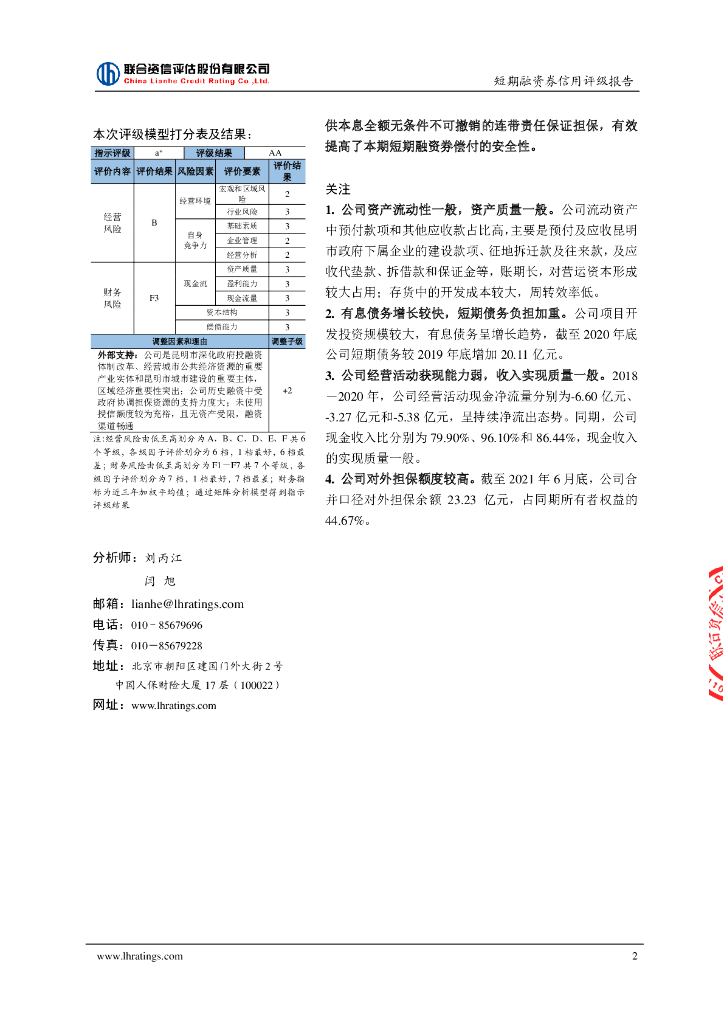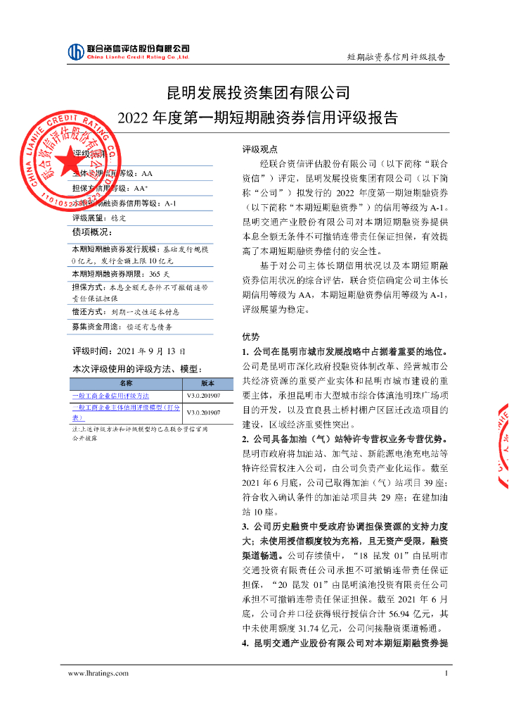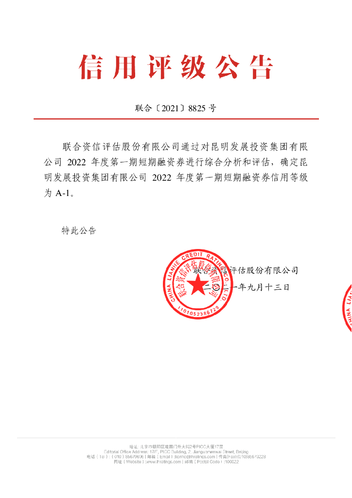 中诚信:昆明发展投资集团有限公司2022年度第一期短期融资券信用评级报告.pdf